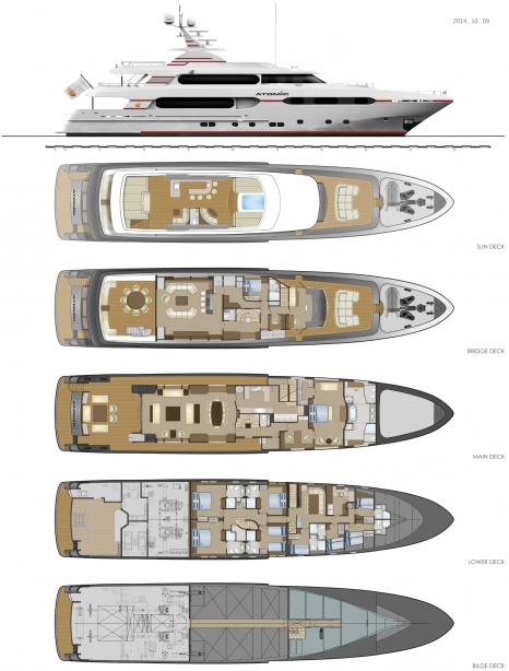 Atom Yacht. With a beam of 8.93 m and a draft of 2.91 m, she has a steel hull and aluminium superstructure. Her top speed is 17kn and she boasts a maximum cruising range of 5200.0 nm at 12kn, with power coming from two caterpillar diesel engines. She can accommodate up to 12 guests in 6 … She was built by sunrise yachts in 2014.